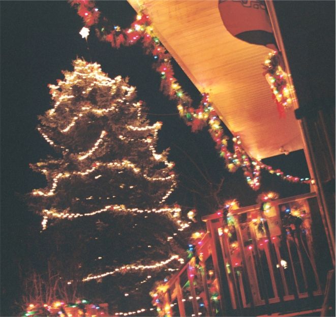 This is the blue spruce after the house was renovated in the fall of 2006. We now have a lovely wooden front landing to decorate with pine roping and Christmas lights. In this shot, you can see the soffits decked out in roping and lights too.
