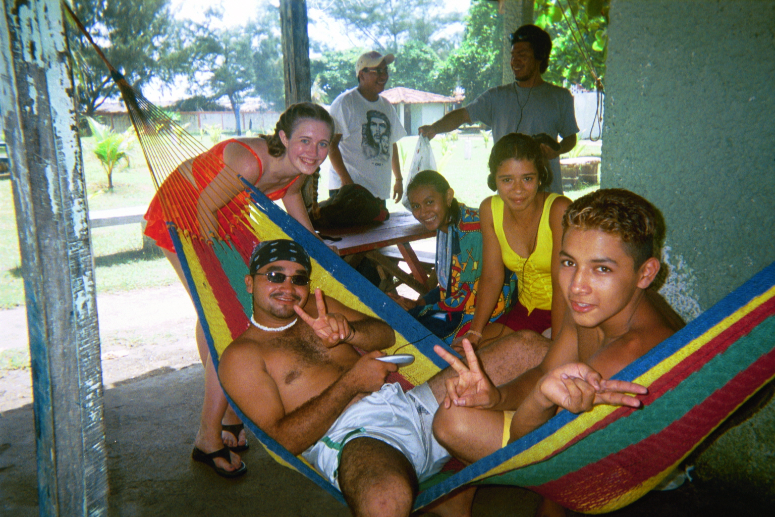 Older youth relaxing at the beach counterclockwise: me (orange swimsuit), Manuel (aka Manuel de Scruffy), Amilcar, and Idalia (yellow shirt). In the background are Gil (left), Xiomara (seated, in beach towel), and Alex (right).