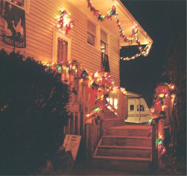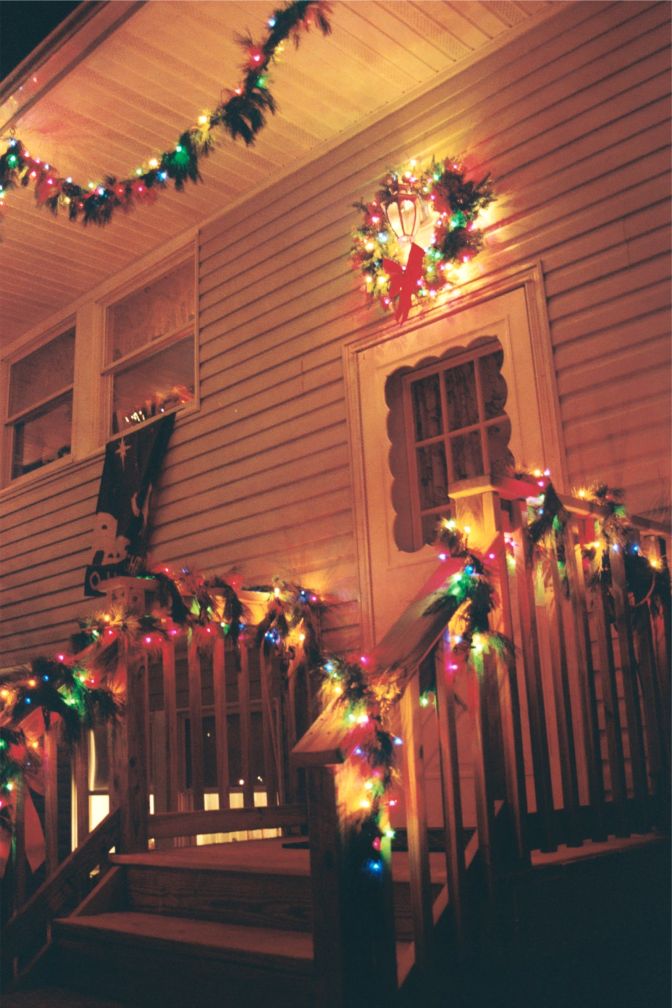 This is the blue spruce after the house was renovated in the fall of 2006. We now have a lovely wooden front landing to decorate with pine roping and Christmas lights. In this shot, you can see the soffits decked out in roping and lights too.