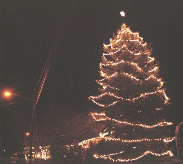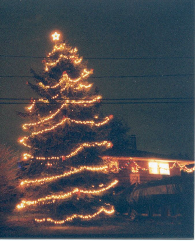 Every year, Ed decorates the 45-foot blue spruce in our front yard. This is how it looked before the house was renovated, when it was covered with barn-red cedar shake shingles.