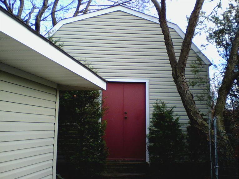 This is our "barn," where, when Ed had his business, he would spray lacquer on furniture and cabinets. Now, it's mostly for storage, but Ed does use it when he makes furniture for us. The red Formica on the doors has to be replaced by the light green Formica we bought to match the siding. The barn used to be covered with red cedar shingles, just like the house.