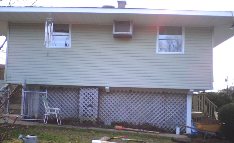 The north side of the house. The latticework, like the new front and back stairs, is made of pressure-treated wood. It's been in place for several years and has already weathered to a nice silver