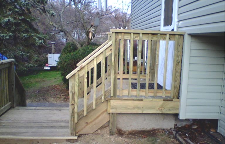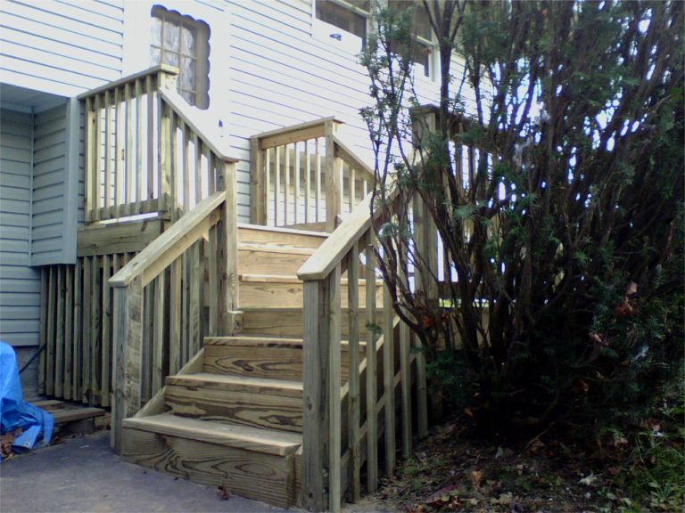 Side view of the new front stairs, which are made from pressure-treated wood so that they're rot-resistant. We won't paint them but will let them weather to a pretty silver.